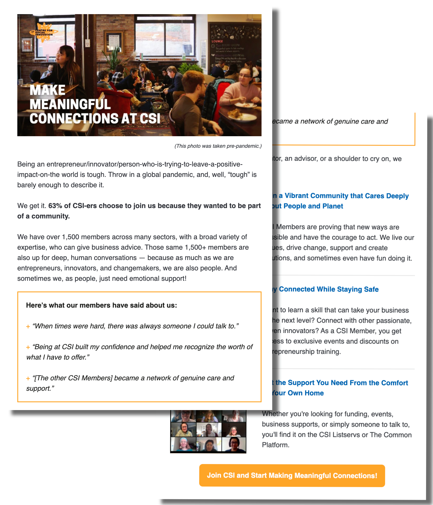 I wrote two introductions: one doubling down on finding support (professional and emotional) at CSI, the other highlighting how our staff helps new members find their footing in a new community. (The latter aimed to tap into the fear of joining a new group and not being heard — I show my work in the appendix.)